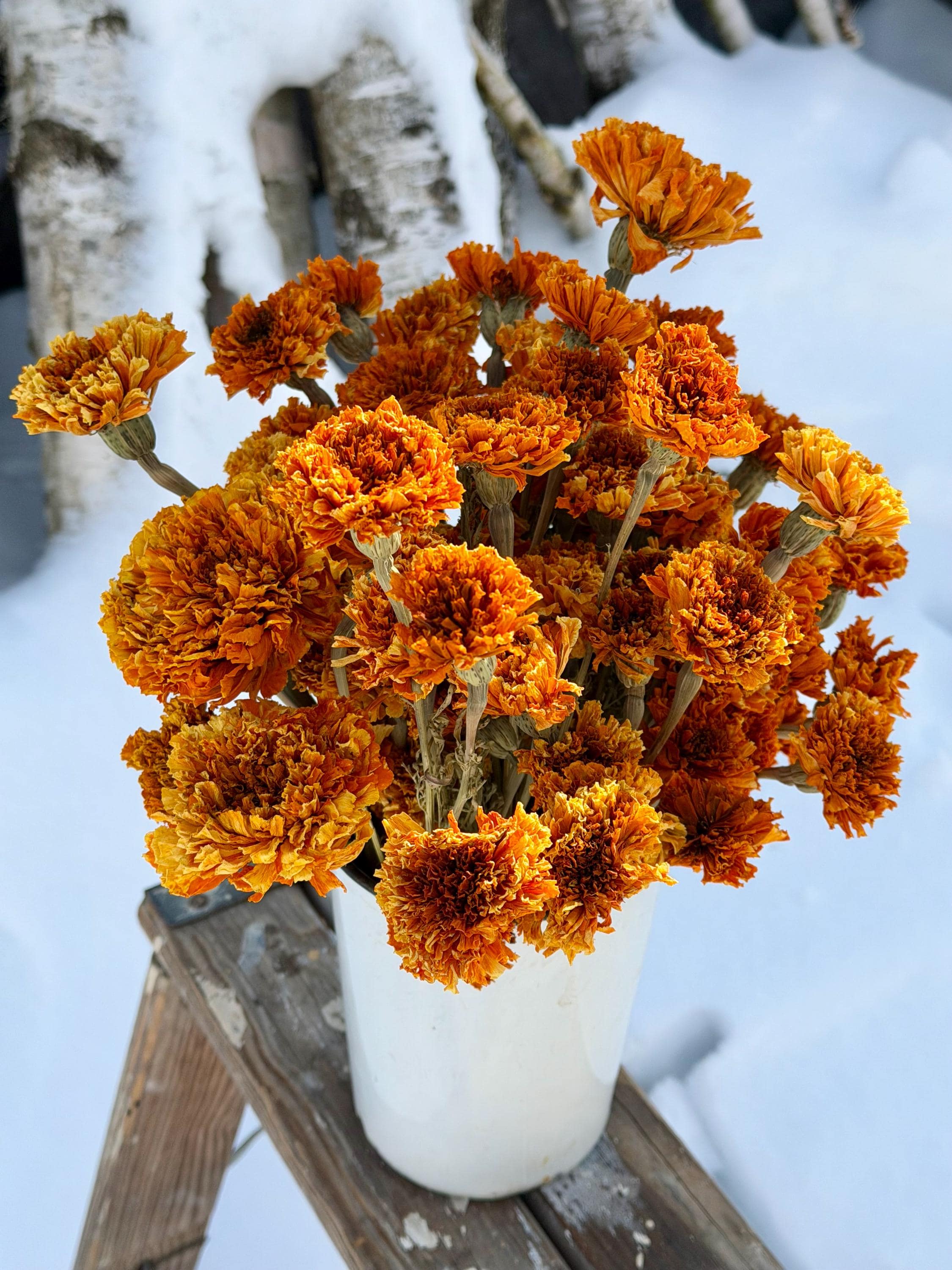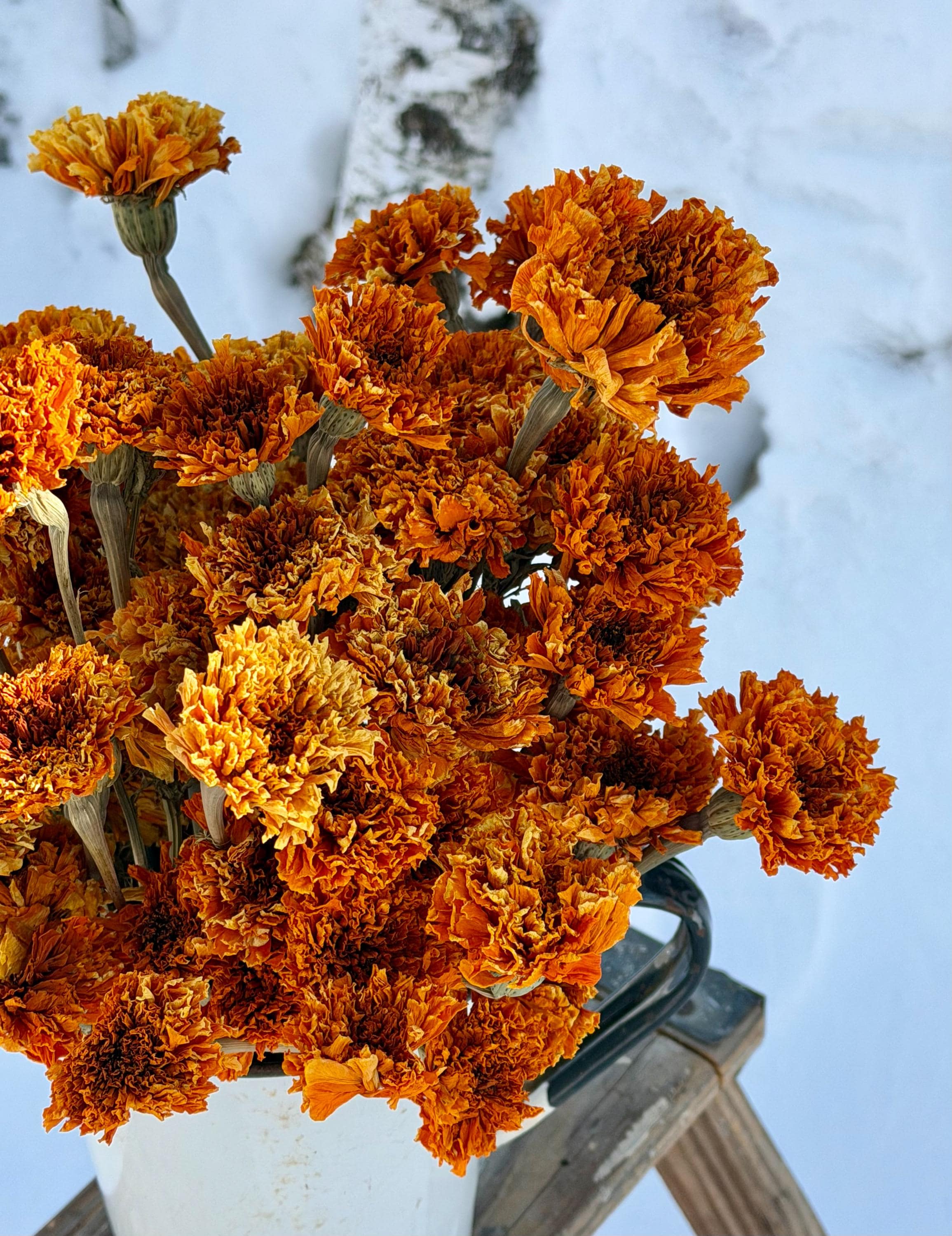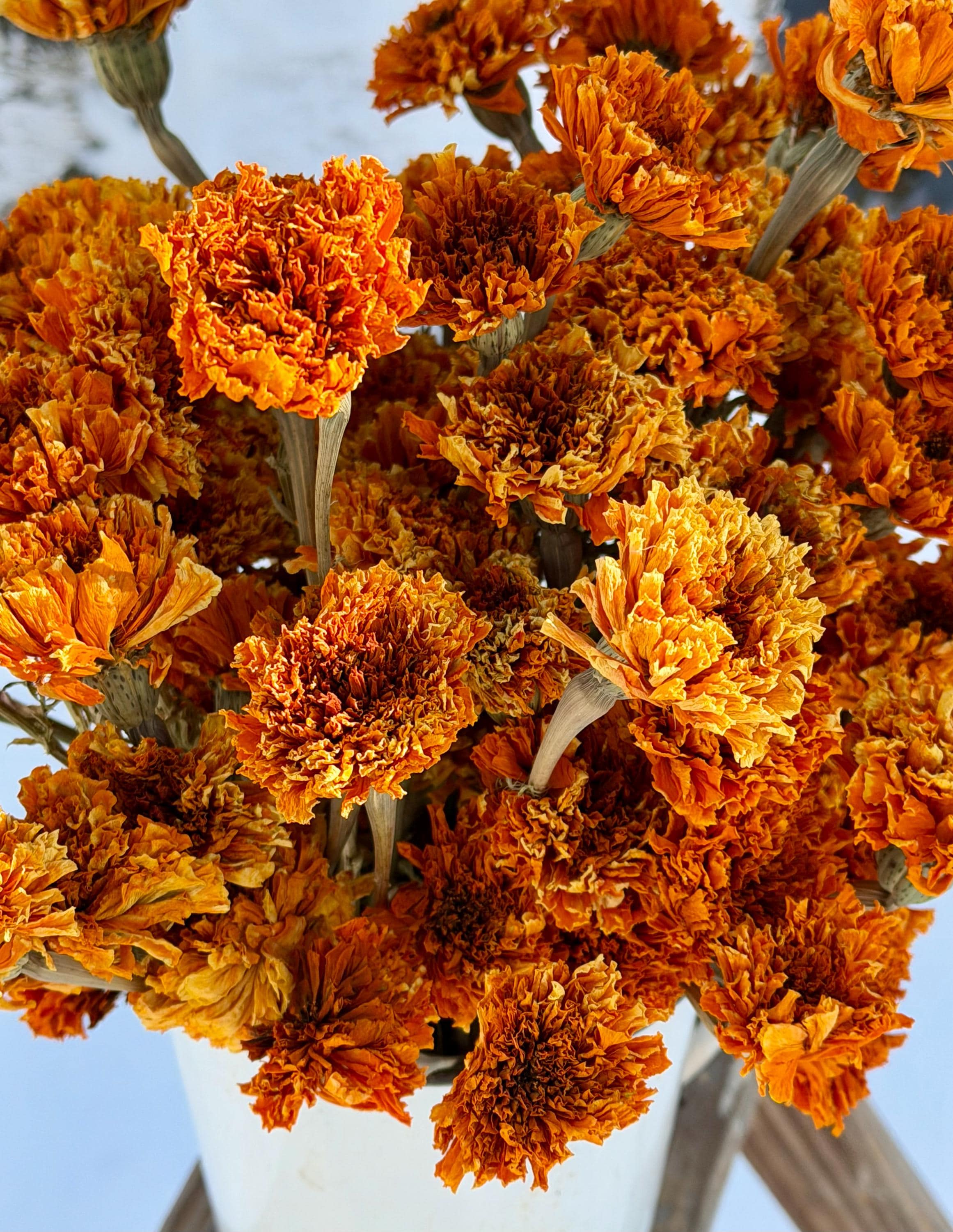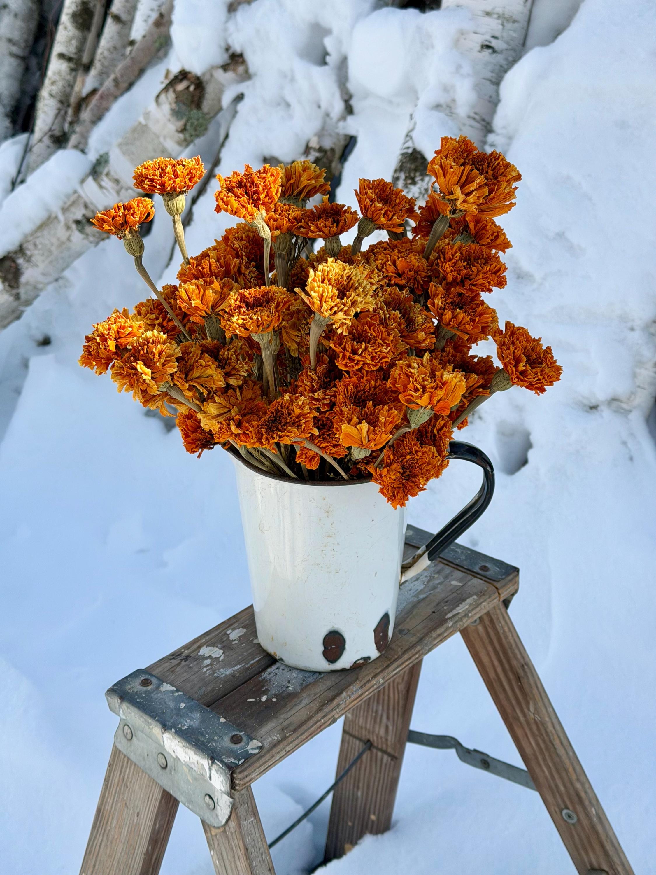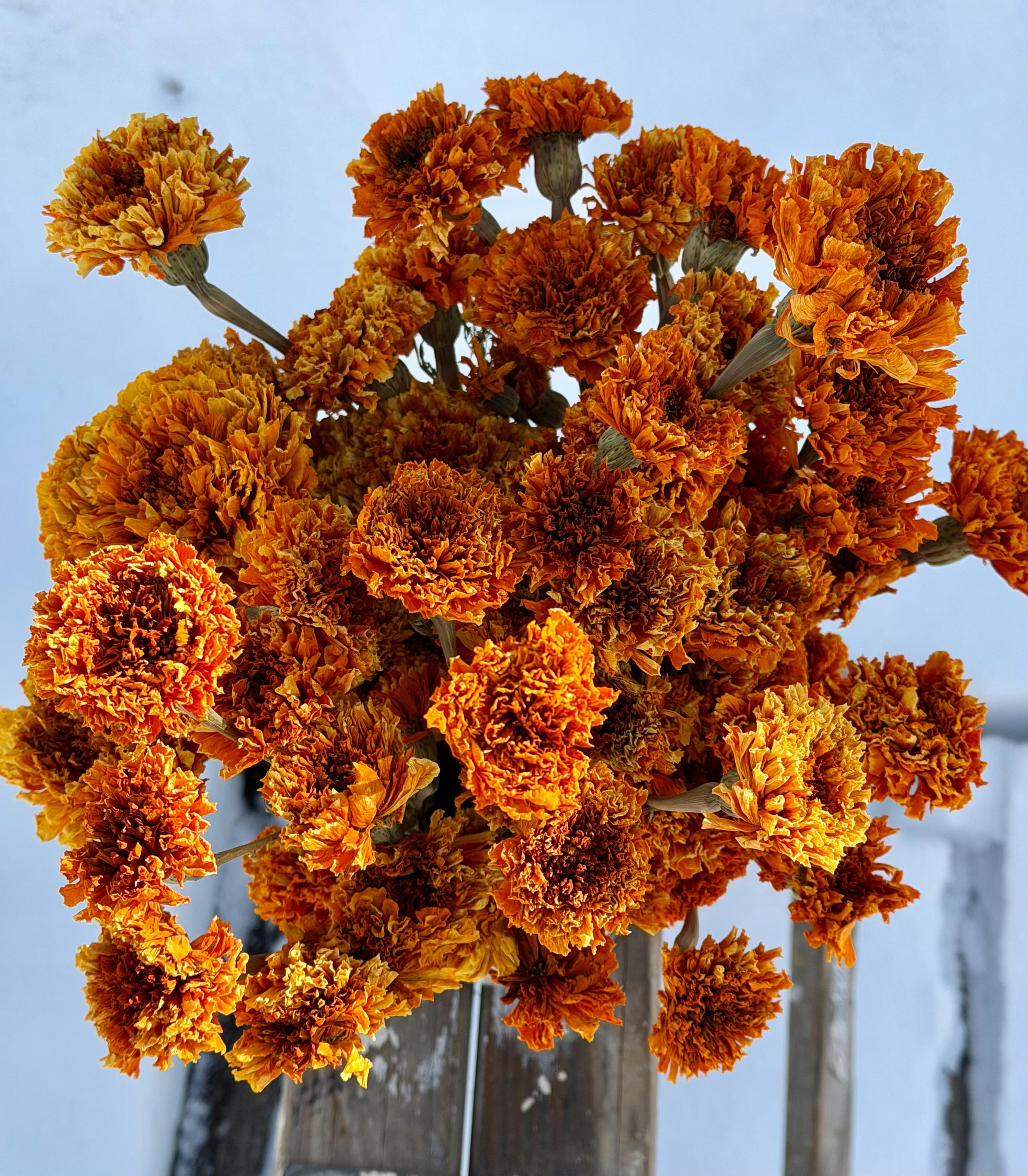 **Note: These Marigolds are slightly faded and are not our number one Marigolds which are shown in our other listing). The Marigolds are air dried, so the stems and flowers will be more fragile.