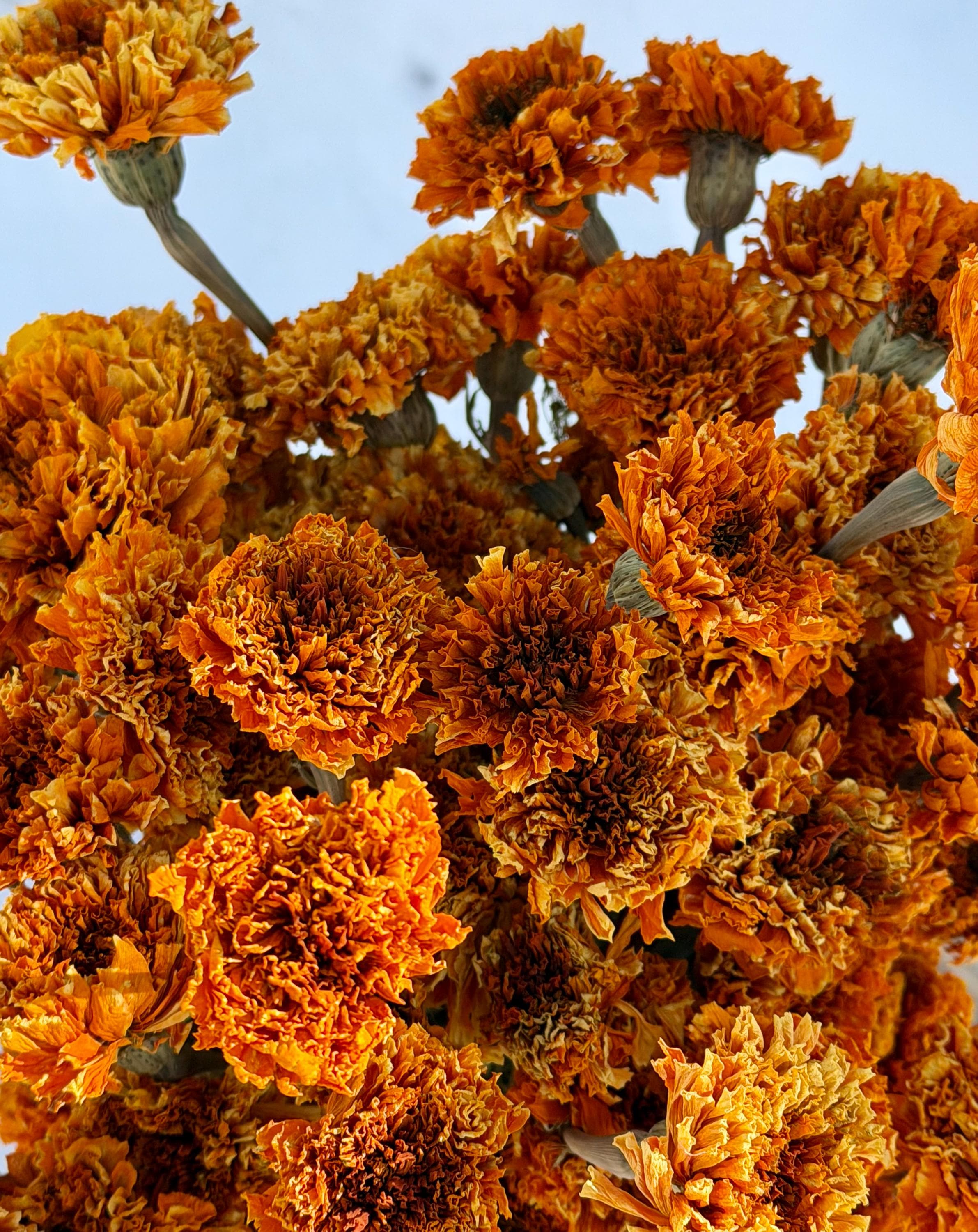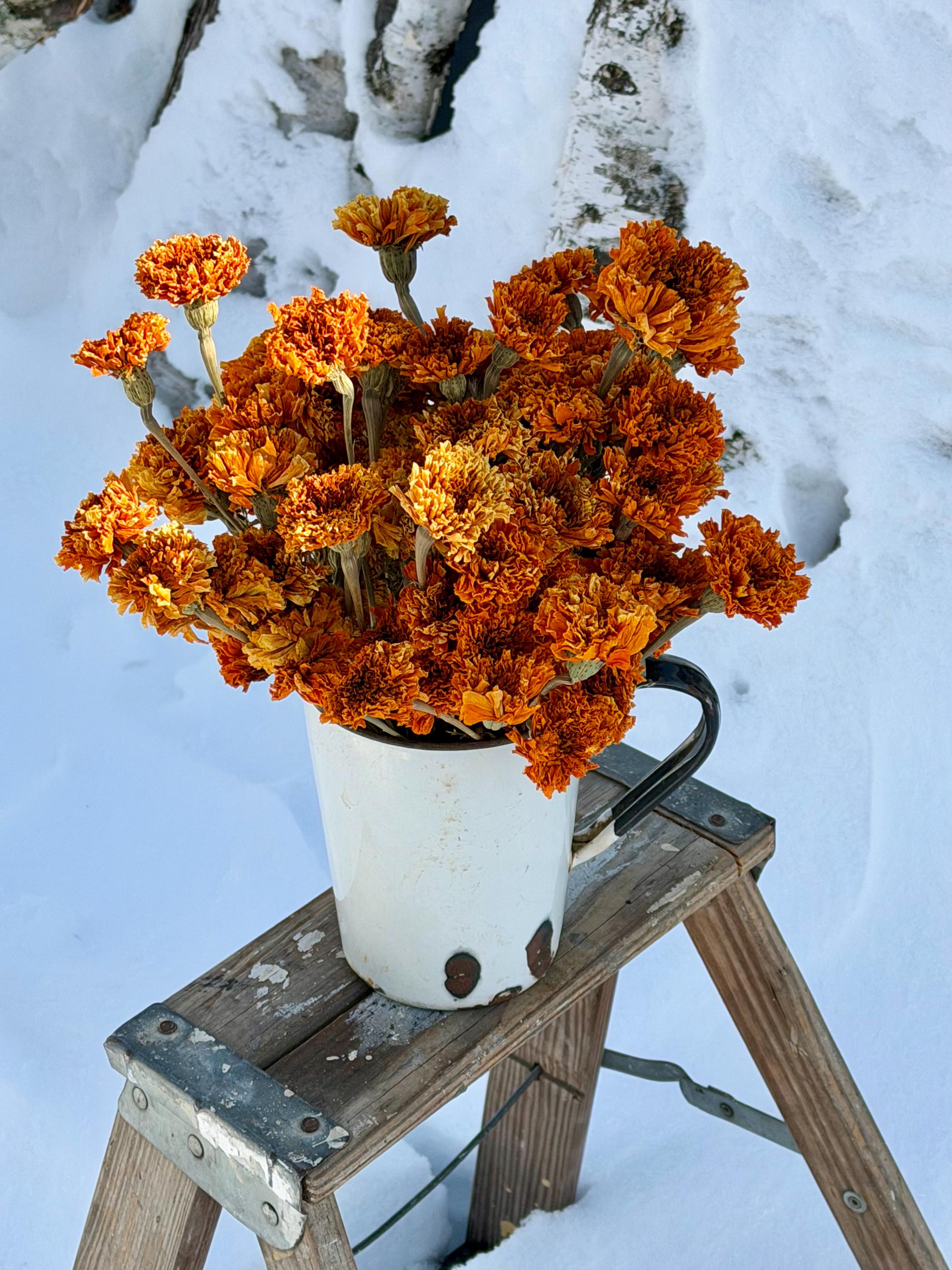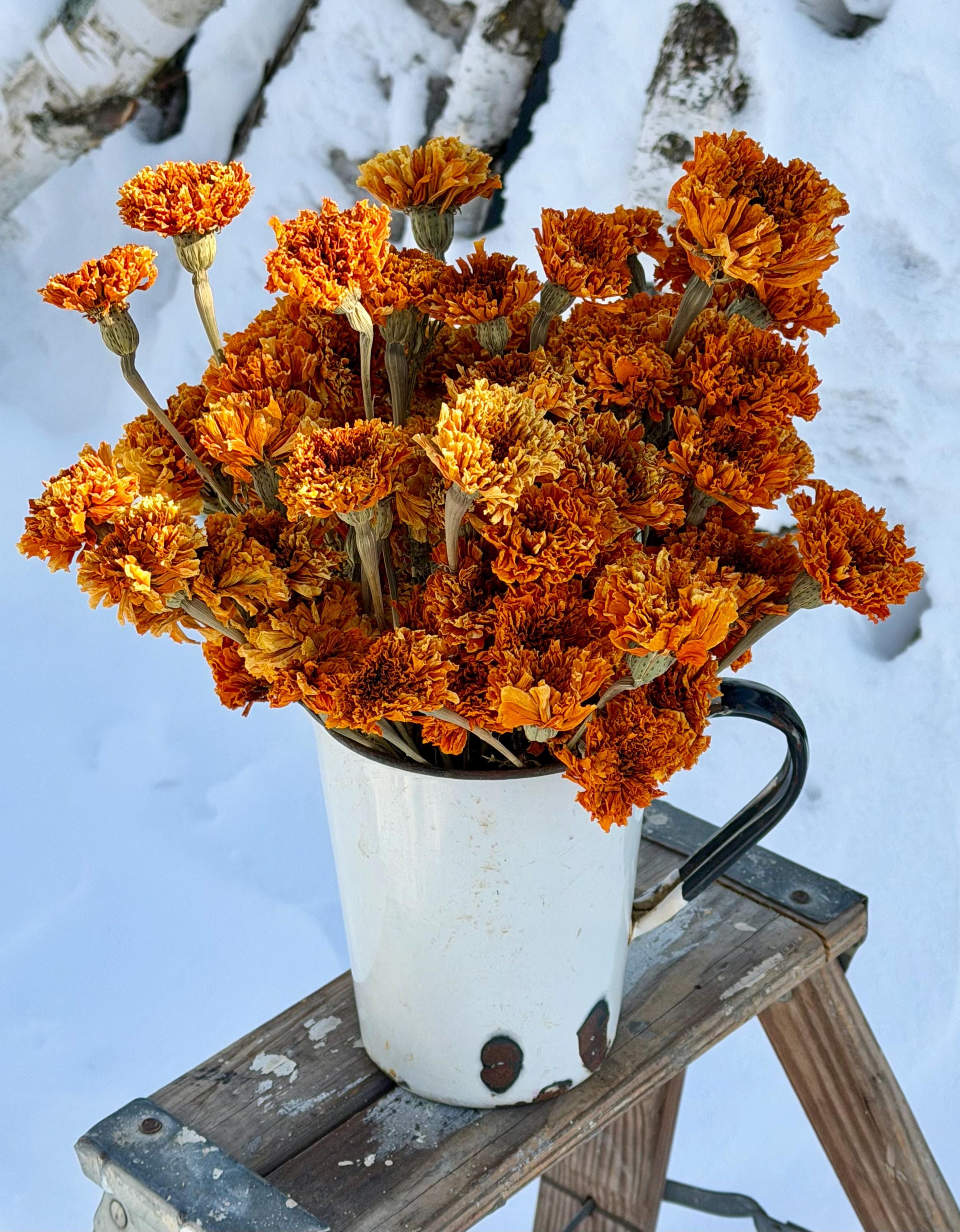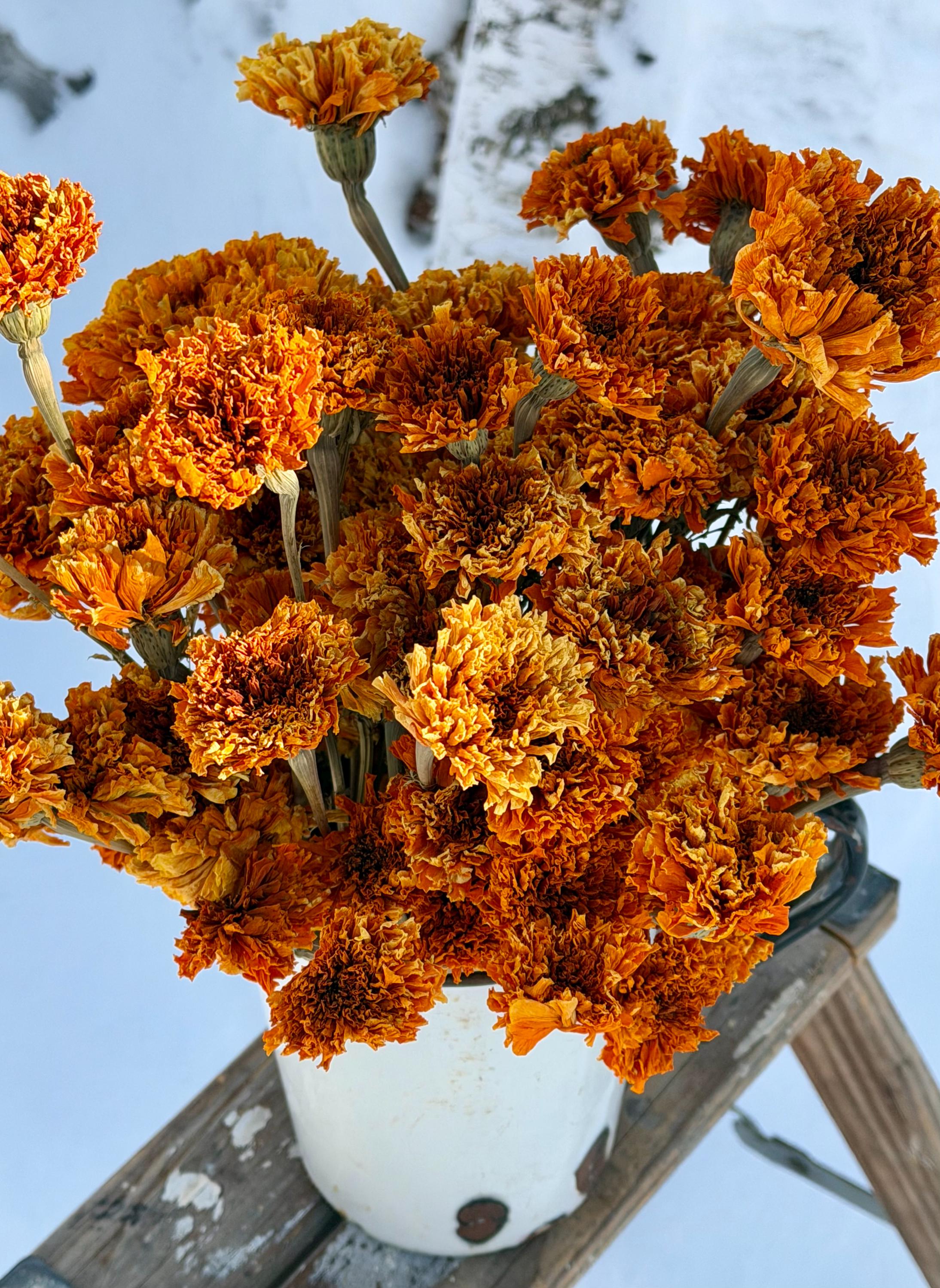 This listing is for 4 ounces of Slightly Faded Orange Marigolds....which is approx. 66 total stems. The 66 stems will be secured in smaller bunches that we had field picked and then air dried.